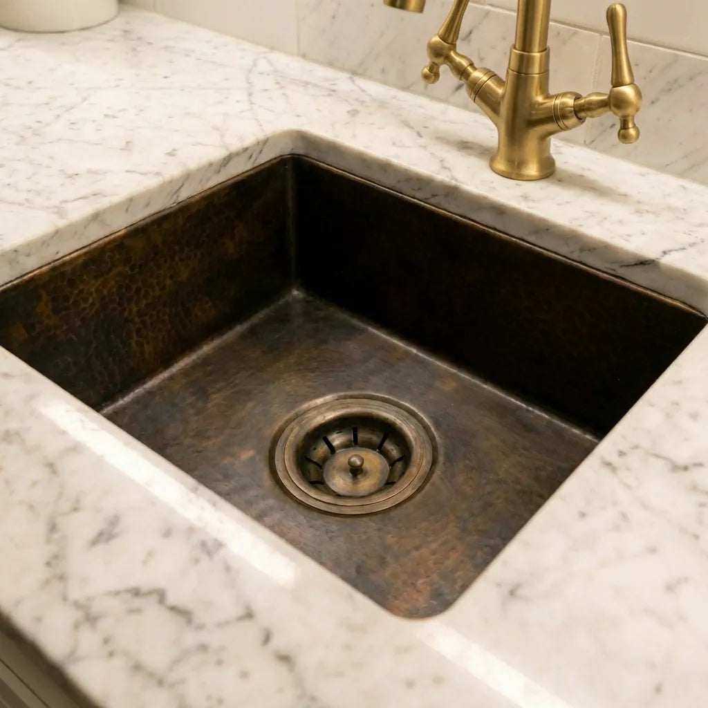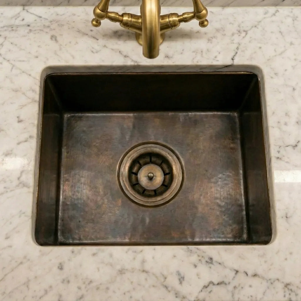 Aged Copper Patina farmhouse sink with flat grid