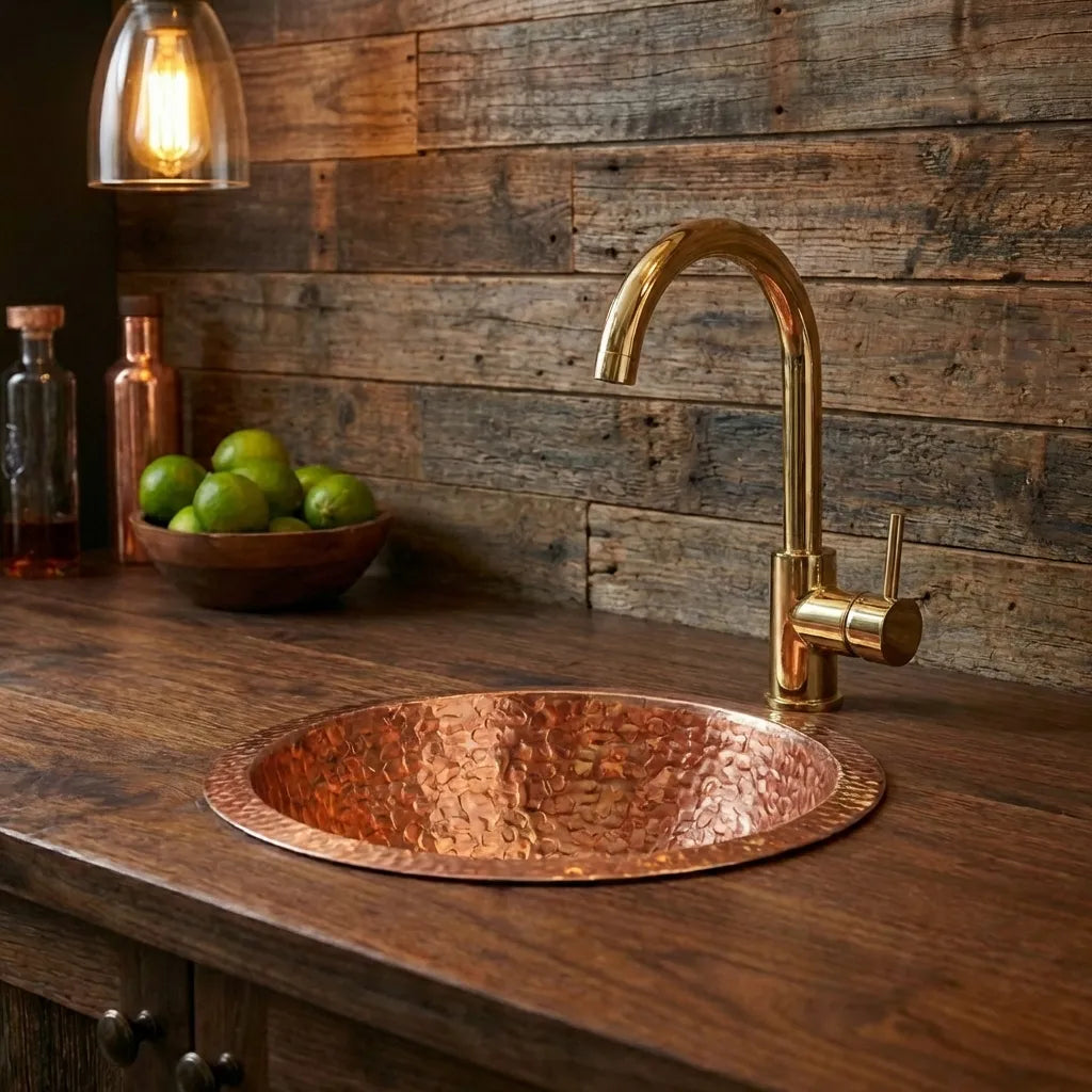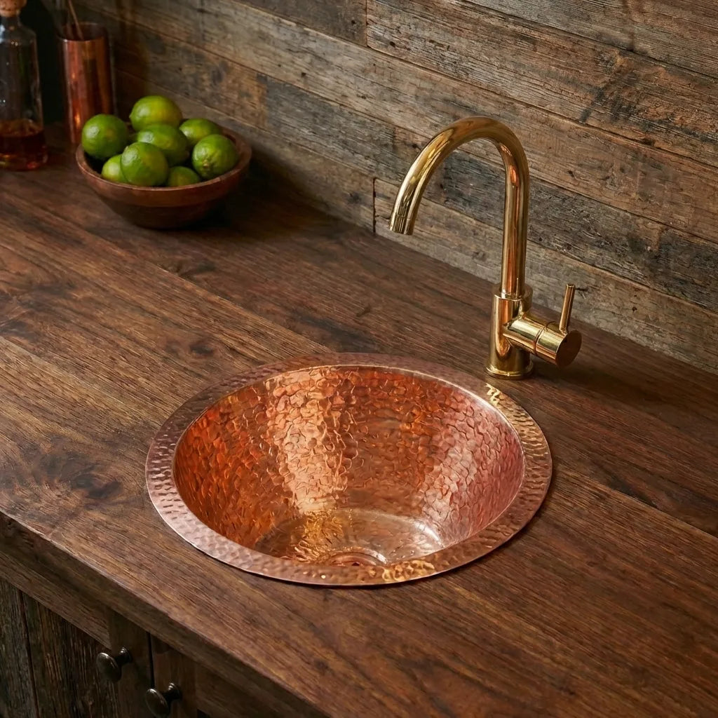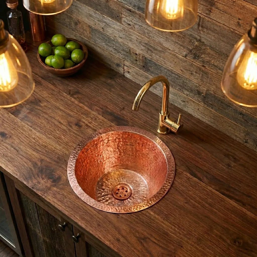 Copper Round Bar Sink, Hammered Copper Round Drum Bar Sink Including Drain