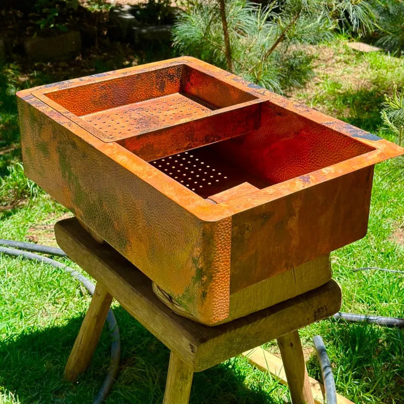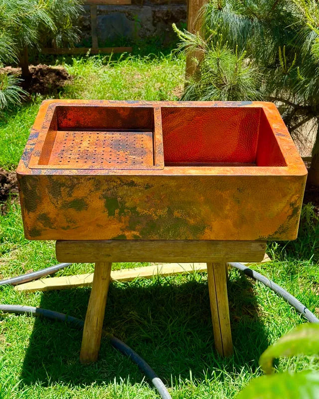 Aged Copper Patina farmhouse sink with flat grid
